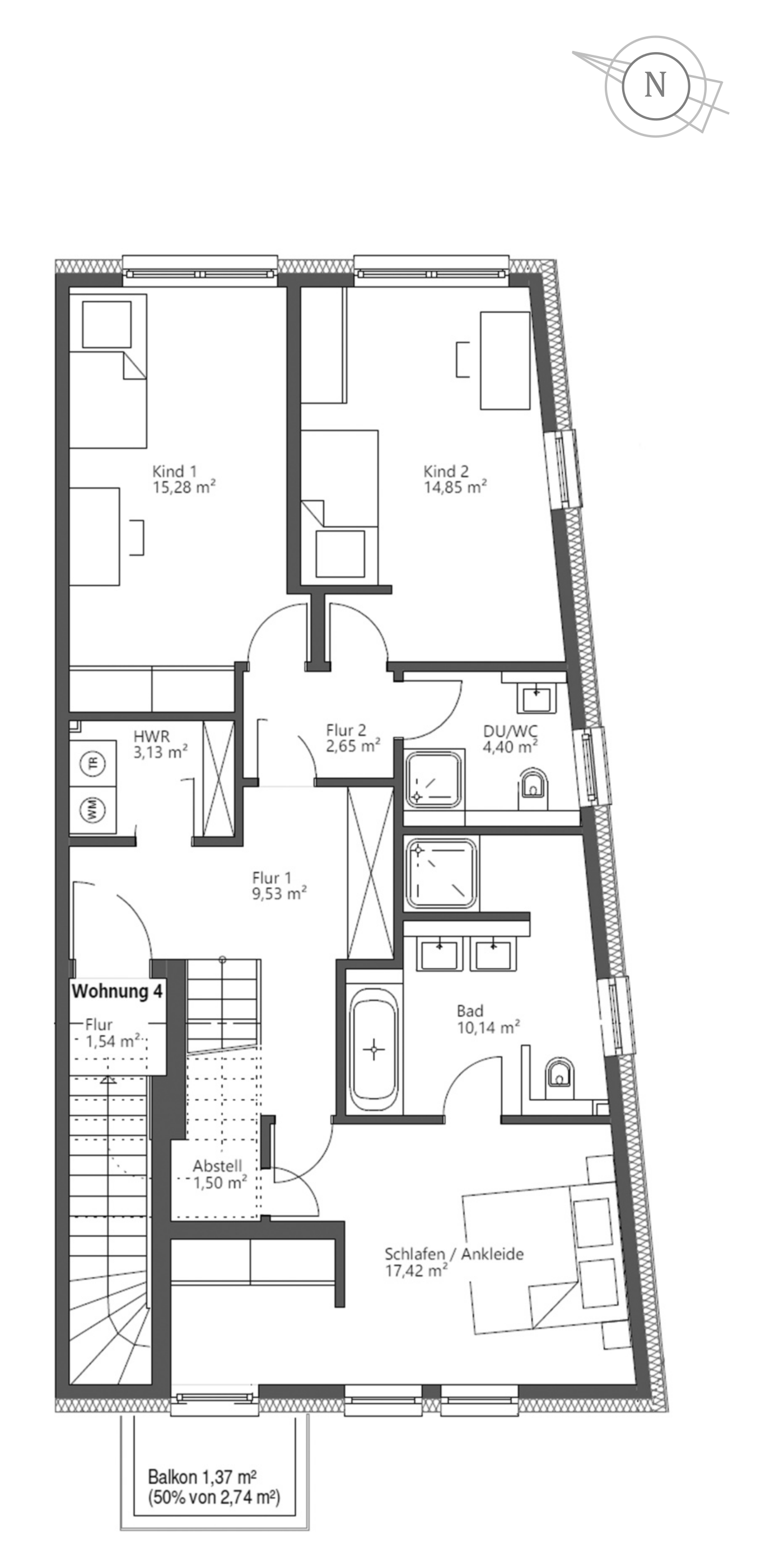 Die ca. 149 m²-Obergeschosswohnung besteht aus vier Zimmern und drei Bädern bzw. WC, verteilt über zwei Geschosse und aus einer etwa 15 m² große Dachterrasse und einem Balkon. Ein Kellerraum von 21 m² Fläche der Wohnung zugehörig. Zusätzlich zur Wohnung kann ein PKW-Stellplatz in einem Parklift für 55.000,00 € erworben werden.